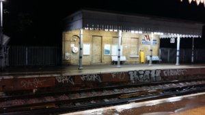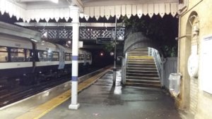 Éjfél lesz 2perc múlva. Megérkeztem az utolsó állomásra. Innen már séta. Kéne egy kocsi. Szakad az eső, itt nincs lift az állomáson és nehéz a cucc..